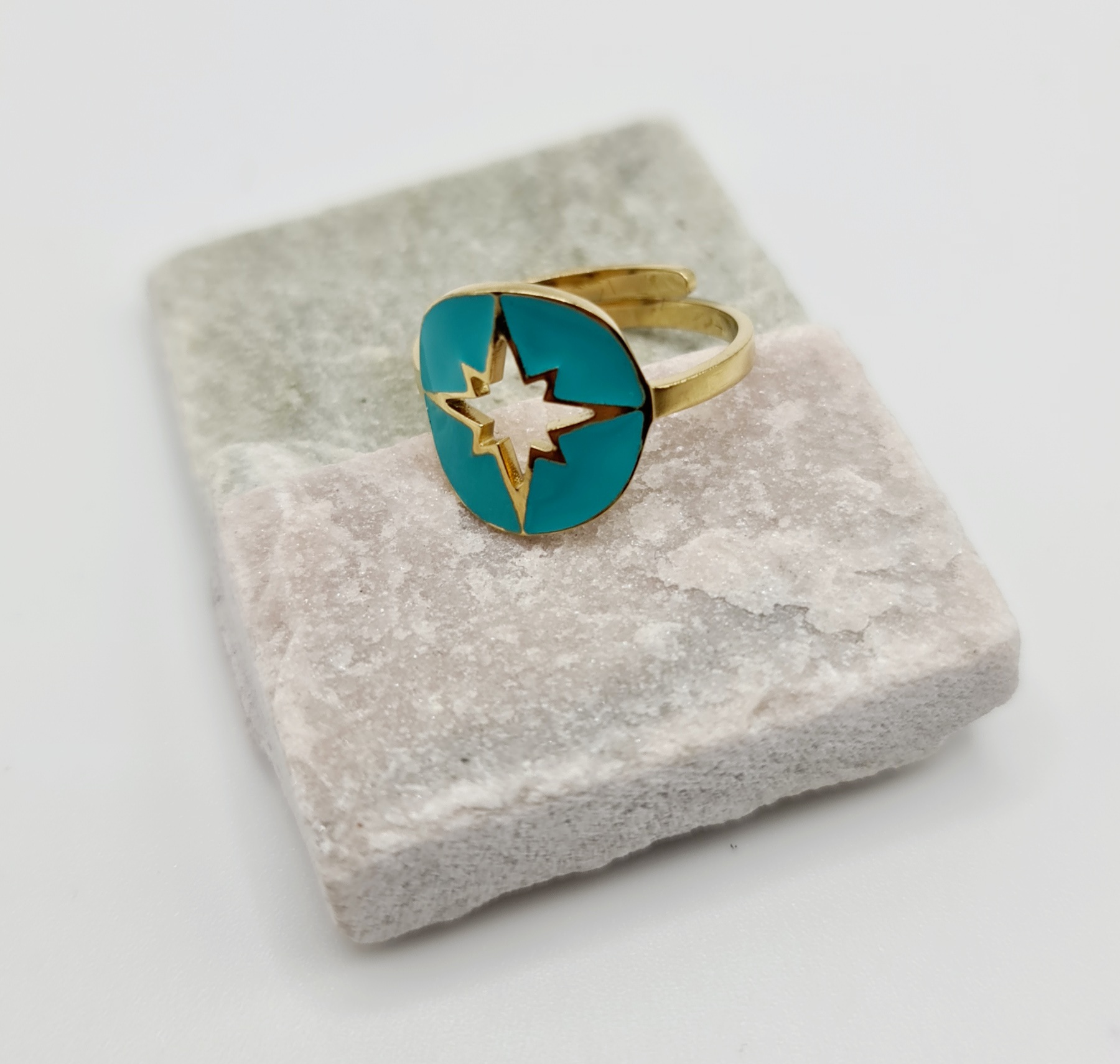 Retrouvez sur notre site internet notre modèle de bague Albane. Idéale pour un cadeau ou pour vous faire plaisir, cette bague ajustable est disponible en turquoise & doré. De grande qualité, nos produits sont en acier inoxydable et hypoallergéniques. Ils ne noircissent pas et résistent à l’eau.