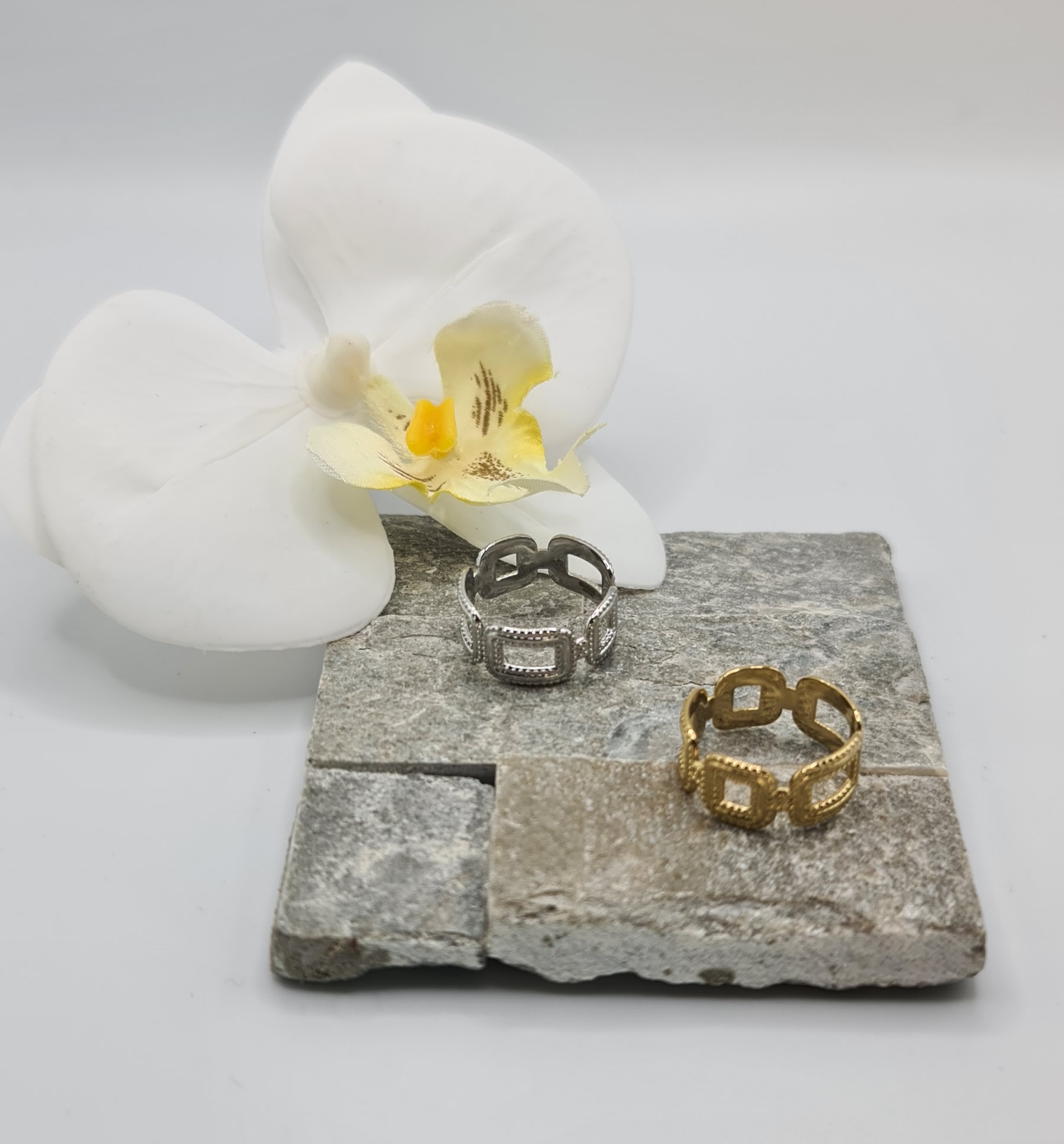 Retrouvez sur notre site internet notre modèle de bague Angélique. Idéale pour un cadeau ou pour vous faire plaisir, cette bague ajustable est disponible en doré et en argenté. De grande qualité, nos produits sont en acier inoxydable et hypoallergéniques. Ils ne noircissent pas et résistent à l’eau.