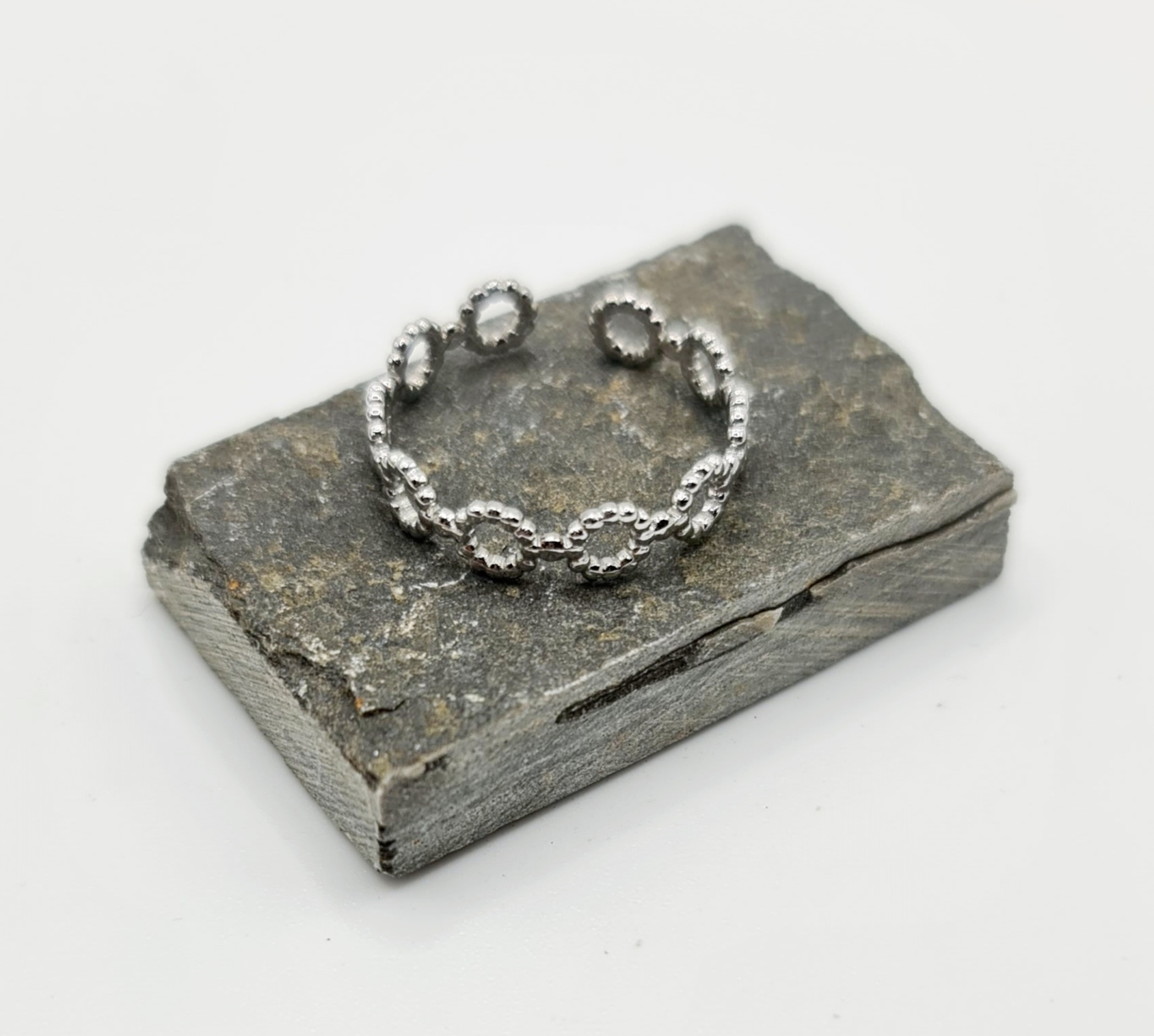 Retrouvez sur notre site internet notre modèle de bague Jade. Idéale pour un cadeau ou pour vous faire plaisir, cette bague ajustable est disponible en argenté. De grande qualité, nos produits sont en acier inoxydable et hypoallergéniques. Ils ne noircissent pas et résistent à l’eau.