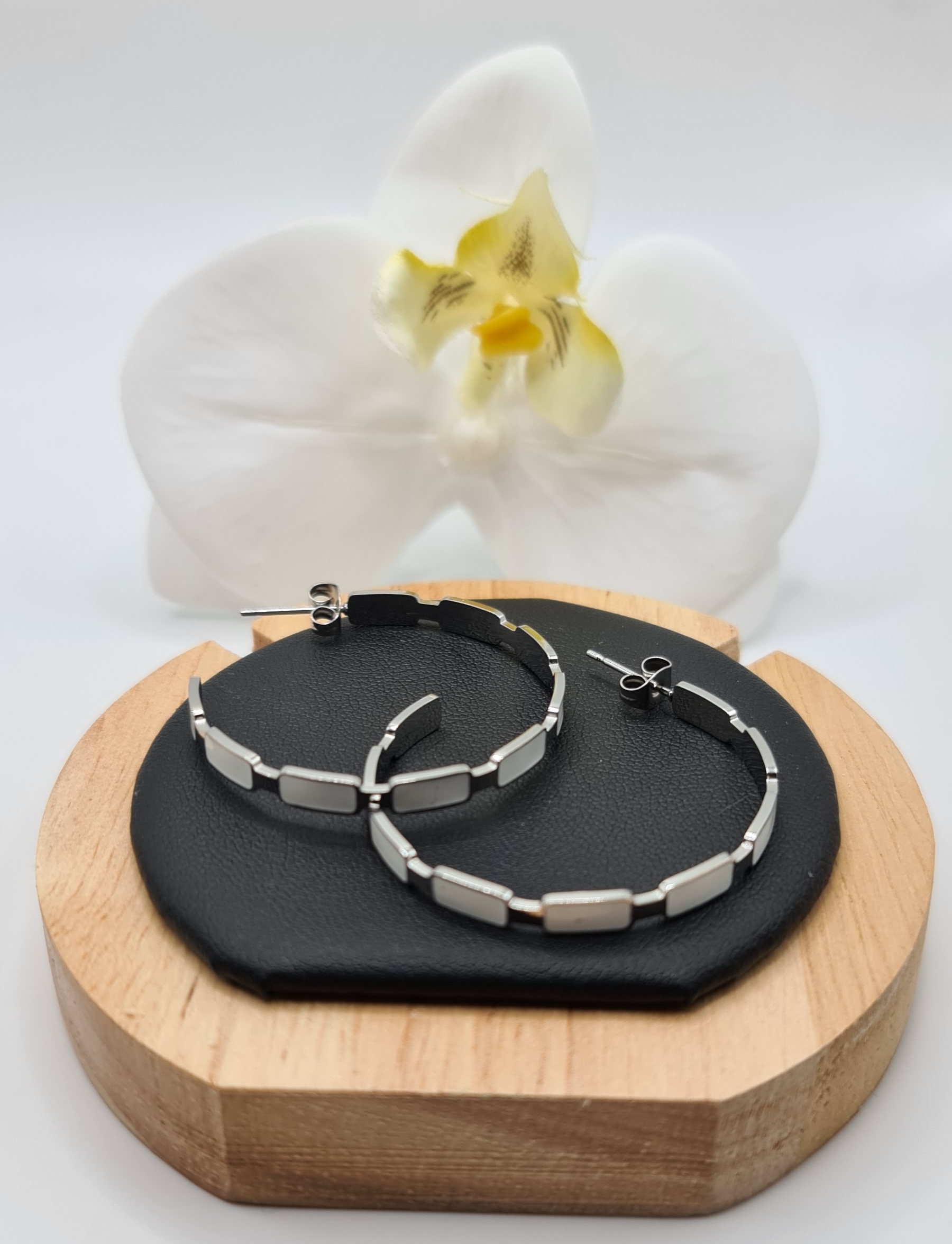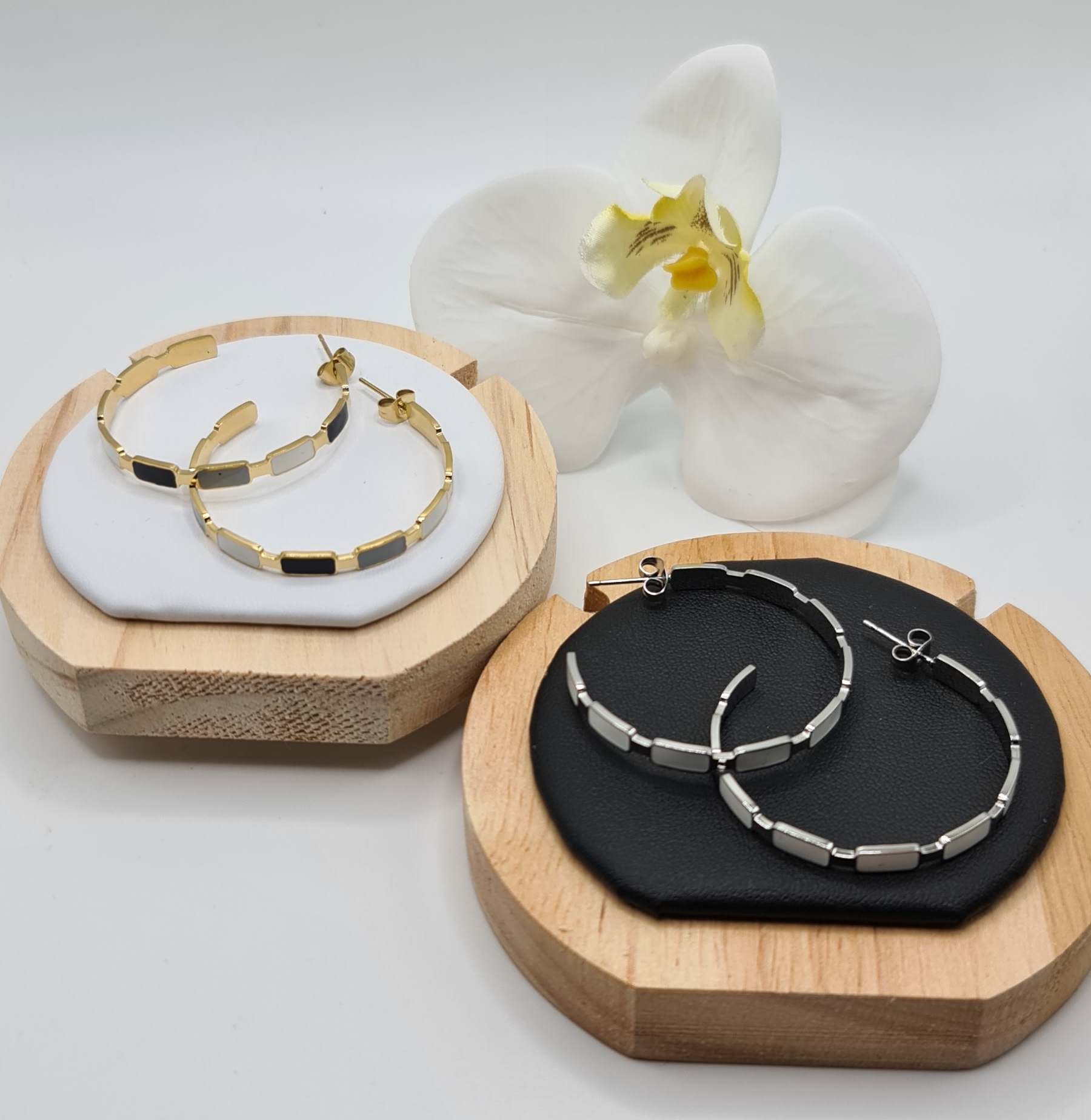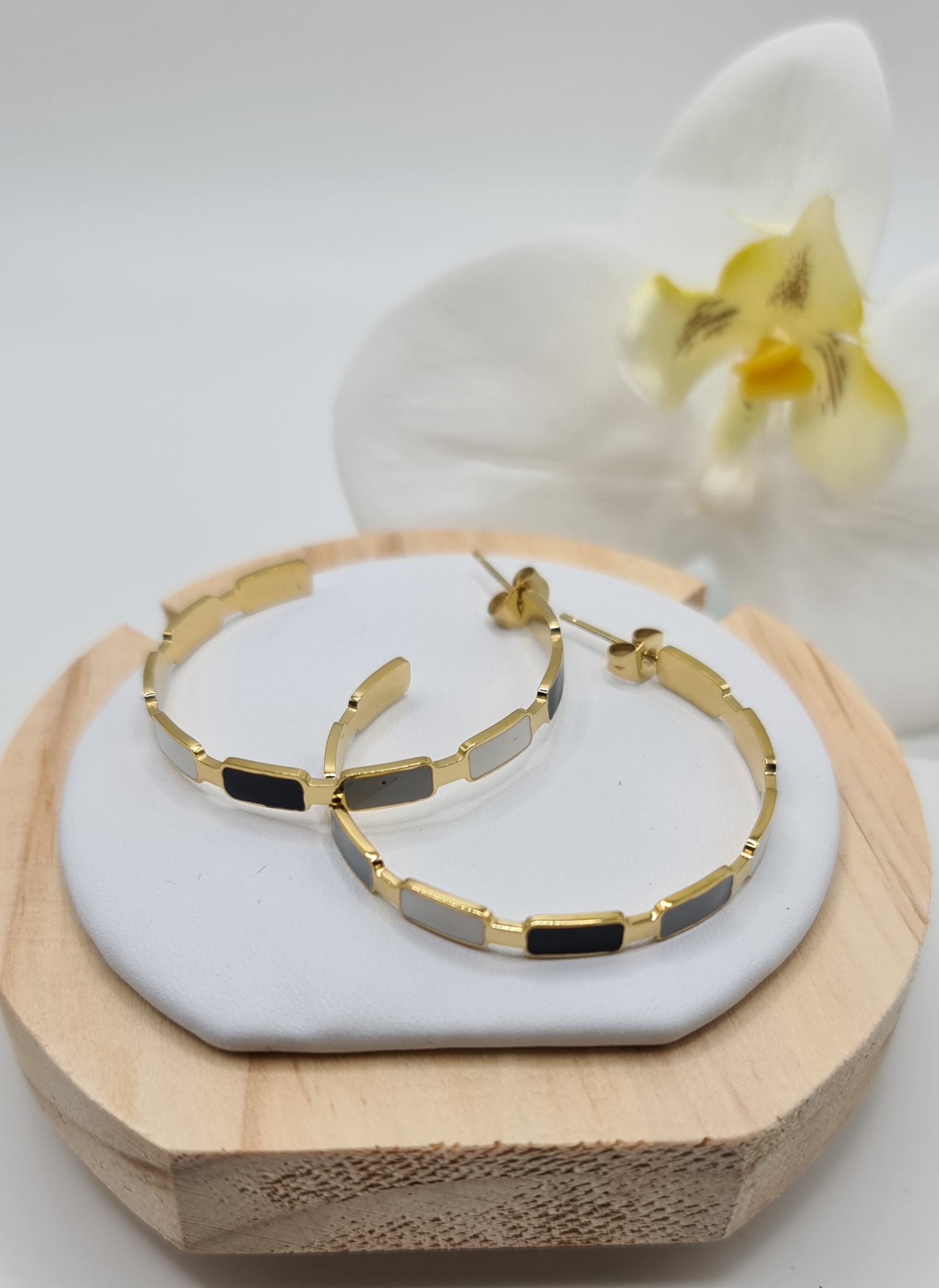 Retrouvez sur notre site internet notre modèle de boucles d’oreilles Créola. Idéales pour un cadeau ou pour vous faire plaisir, ces boucles sont disponibles en noir & doré et en blanc & argenté. De grande qualité, nos produits sont en acier inoxydable et hypoallergéniques. Ils ne noircissent pas et résistent à l’eau.