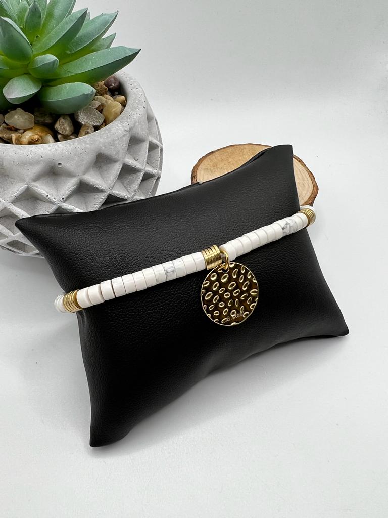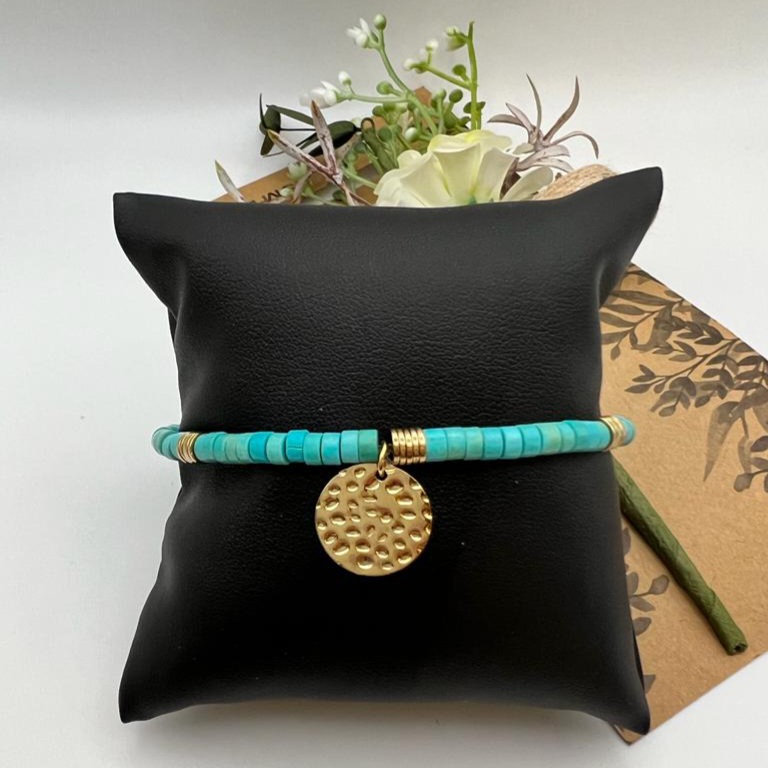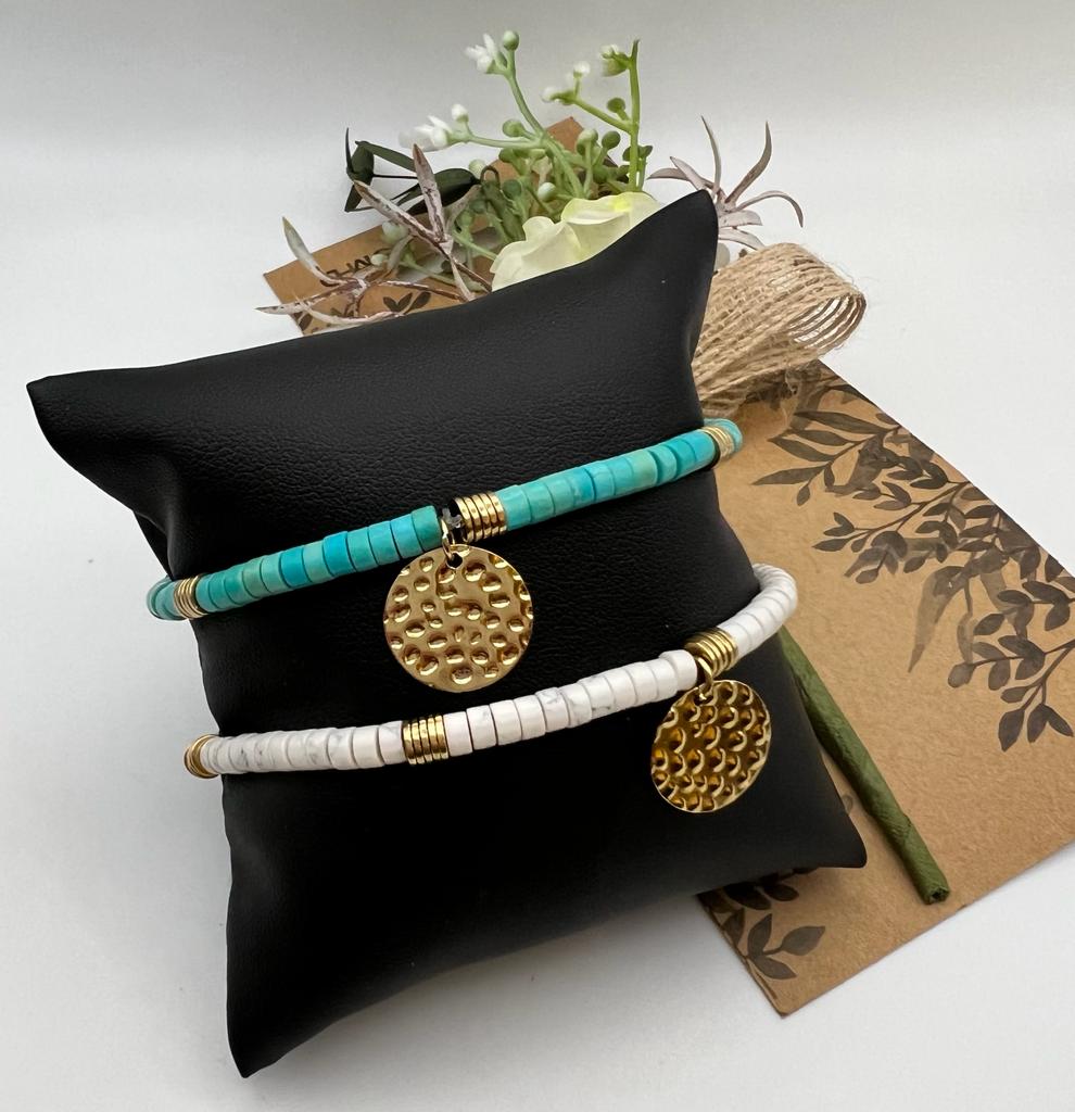 Retrouvez sur notre site internet notre modèle de bracelet Christy. Idéal pour un cadeau ou pour vous faire plaisir, ce bracelet ajustable est disponible en blanc & doré ainsi qu’en turquoise & doré. De grande qualité, nos produits sont en acier inoxydable et hypoallergéniques. Ils ne noircissent pas et résistent à l’eau.