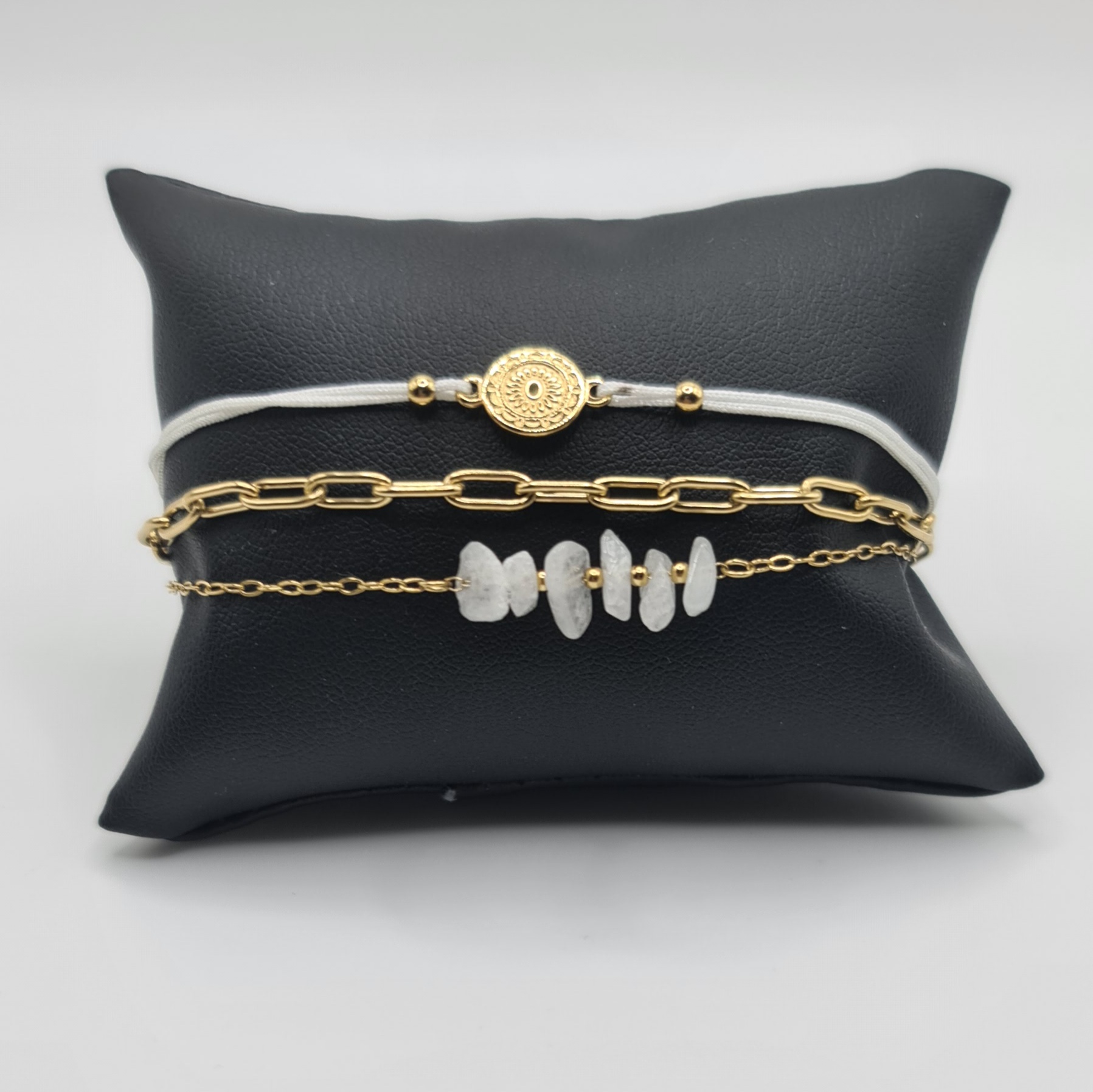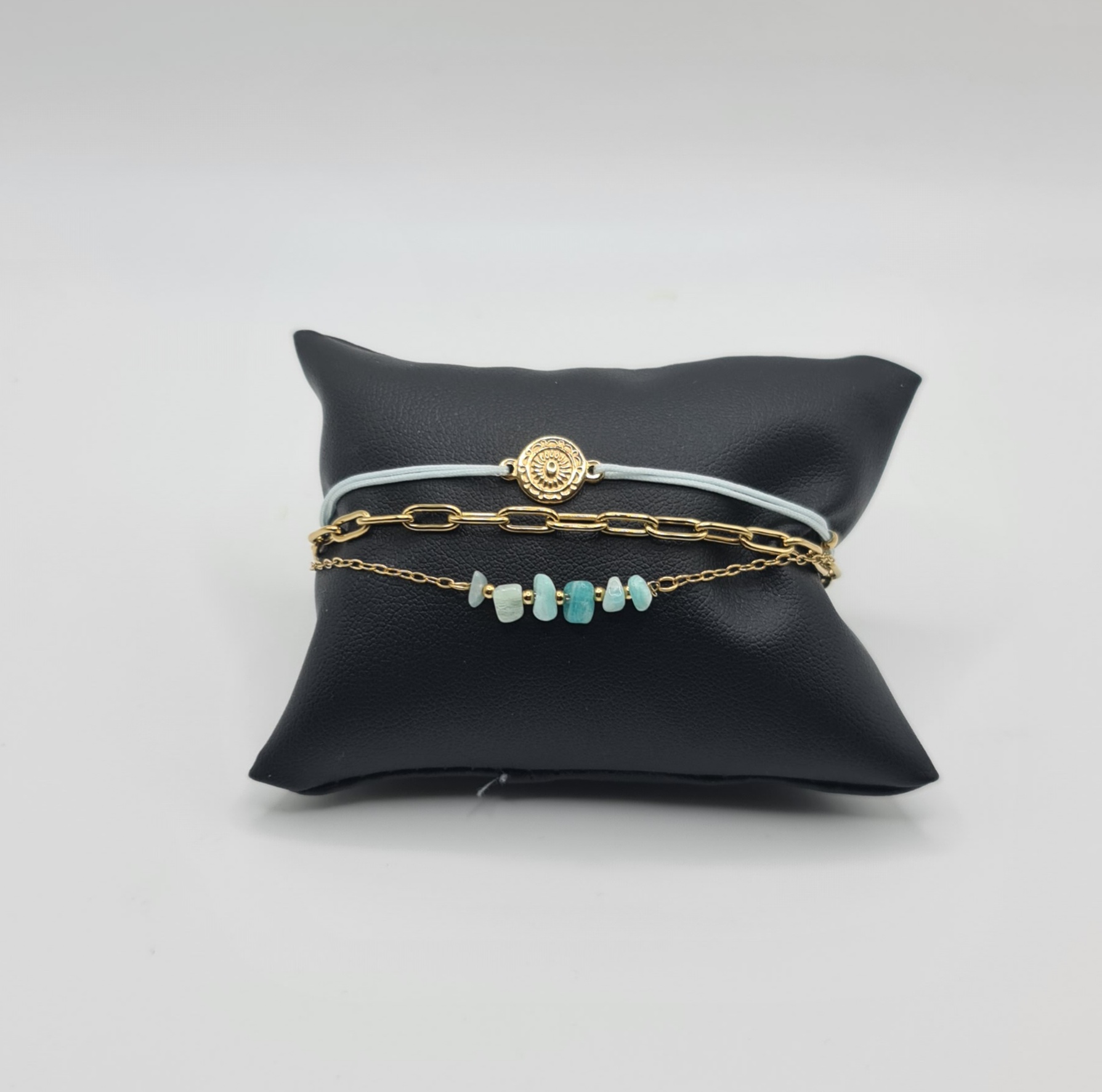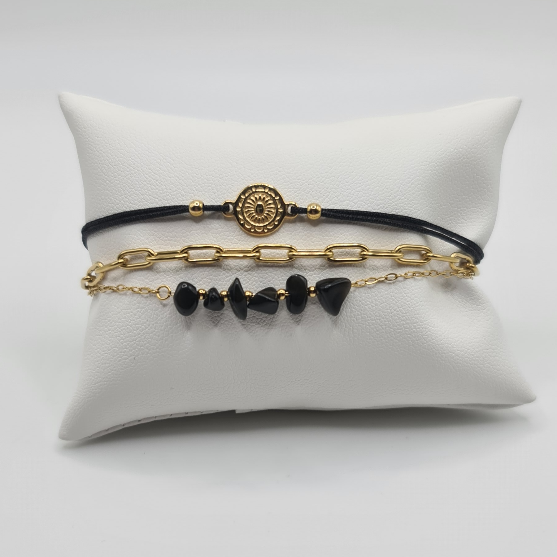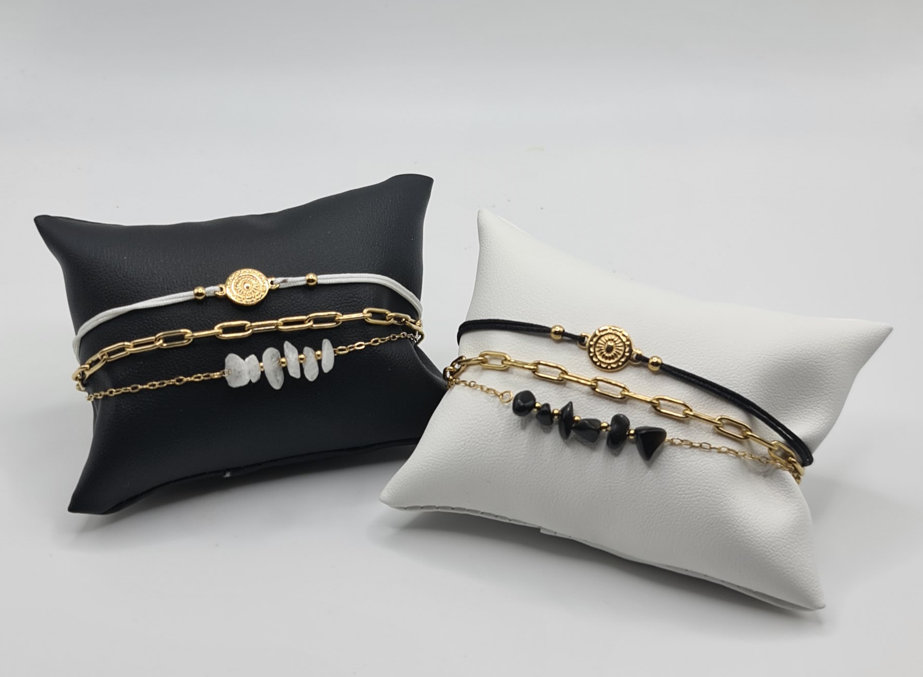 Retrouvez sur notre site internet notre modèle de bracelet Emmy. Idéal pour un cadeau ou pour vous faire plaisir, ce bracelet ajustable est disponible en doré et noir, en doré et blanc et en doré et turquoise. De grande qualité, nos produits sont en acier inoxydable et hypoallergéniques. Ils ne noircissent pas et résistent à l’eau.