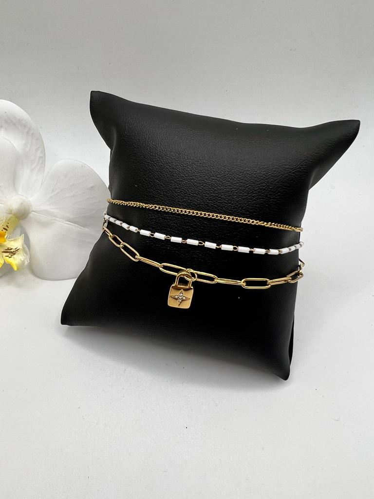 Retrouvez sur notre site internet notre modèle de bracelet Lou. Idéal pour un cadeau ou pour vous faire plaisir, ce bracelet ajustable est disponible en doré & blanc. De grande qualité, nos produits sont en acier inoxydable et hypoallergéniques. Ils ne noircissent pas et résistent à l’eau.